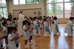 各クラス代表の年長さんが侍者になり、ろうそく、御絵、聖水を手に神父様と入堂しました。