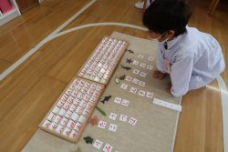 『名詞(文字拾い)移動五十音』 海の中の生き物の名称を、移動五十音で表します。1音1音カードを拾う作業は大変のように見えますが、「る・る・る・る・・・あったぁ~」と楽しんでいます。「先生! ヘビじゃなくて、う・つ・ぼ、だって~!」正誤カードを見て、教えてくれます。